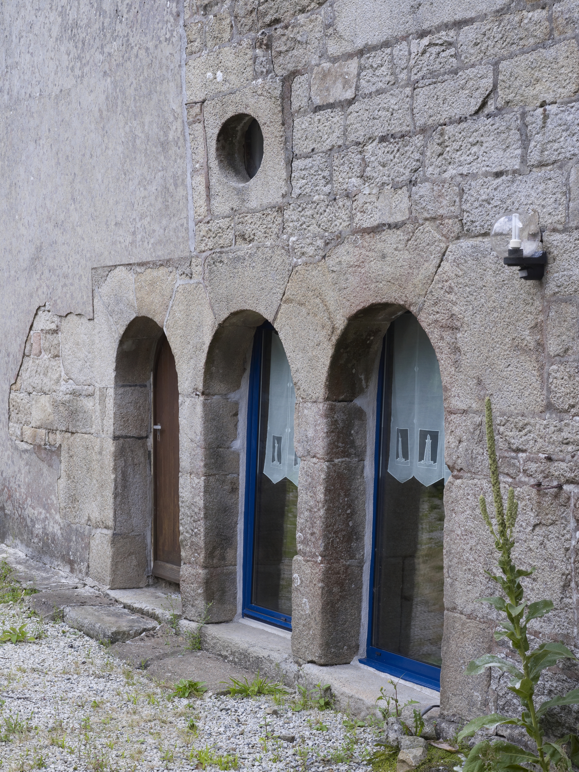Plounérin, le bourg, 13 et 15 rue de l'Eglise : maisons datables du 17e siècle, élévation postérieure, triple porte en arc plein cintre sumontée d'un oculus ovaleImmatriculation