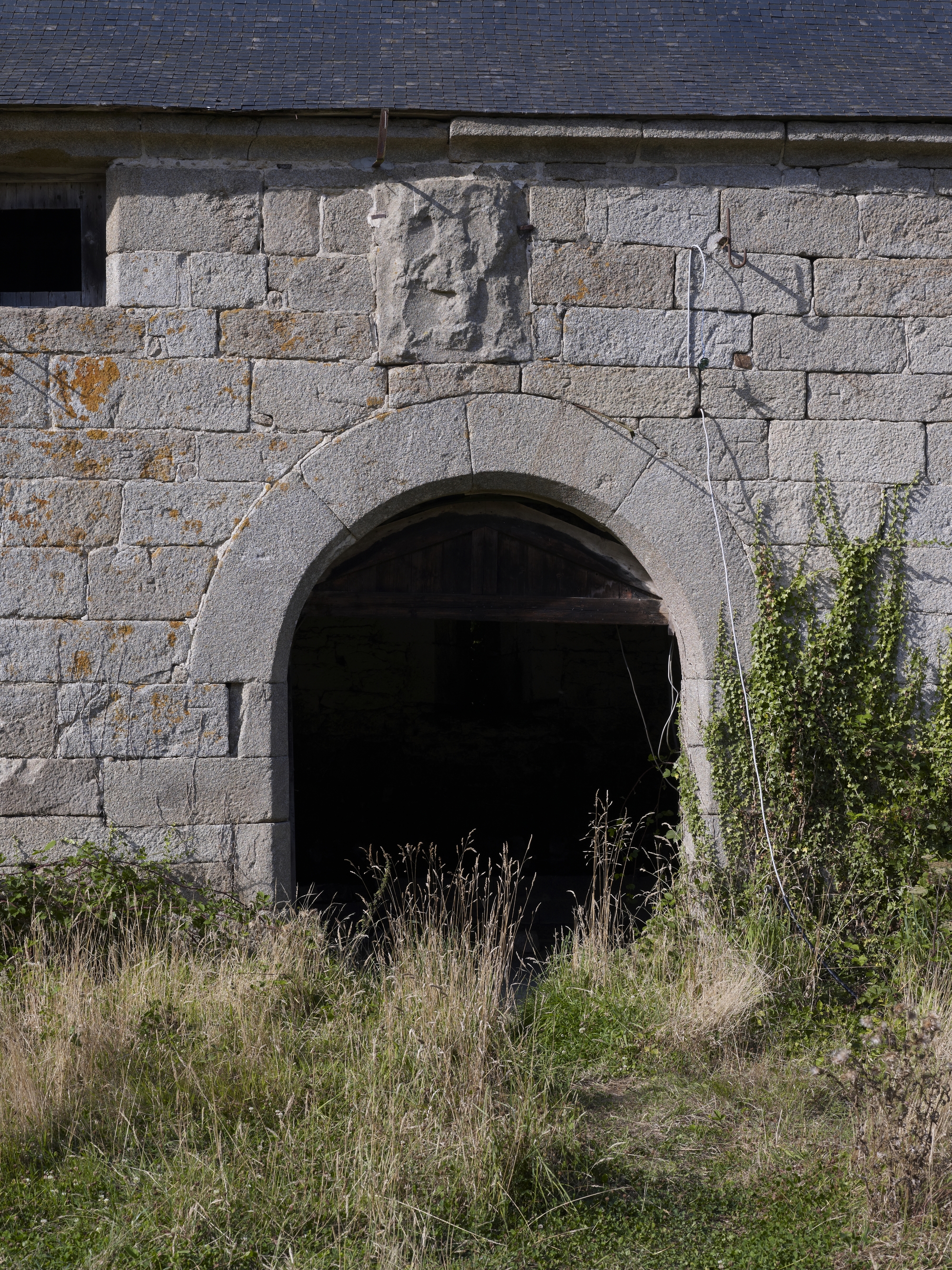 Plouaret, manoir de Guernanchanay : grange, élévation sud, détail de la porte surmontée des armoiries marteléesImmatriculation