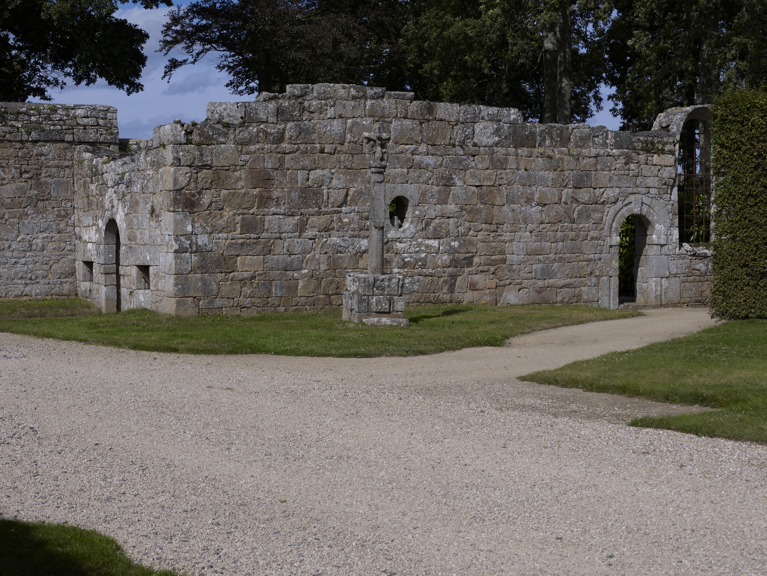 Vue des vestiges de la chapelle située au nord du château et son calvaire. A noter, les portes sud et ouest en arc plein cintreImmatriculation