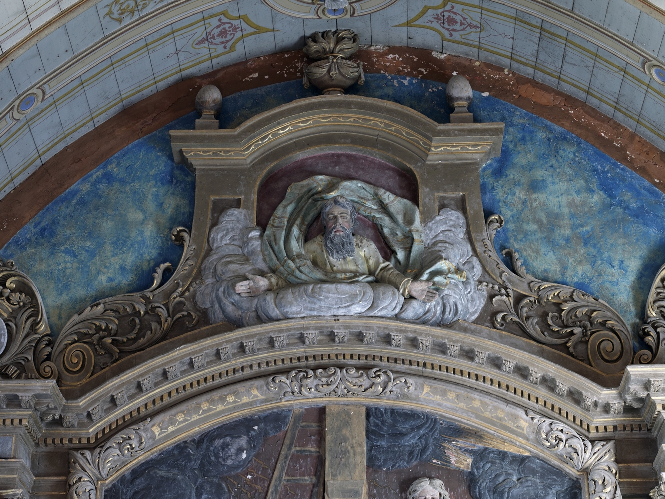 Lanvellec, Saint-Carré : chapelle Notre-Dame-de-Pitié, vue intérieure, détail de la partie supérieure du retableImmatriculation