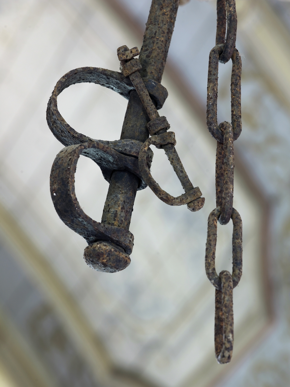 Lanvellec, Saint-Carré : chapelle Notre-Dame-de-Pitié, vue intérieure, chaînes de bagnard (ex-voto : offrande faite à un dieu en remerciement d'une grâce obtenue)Immatriculation