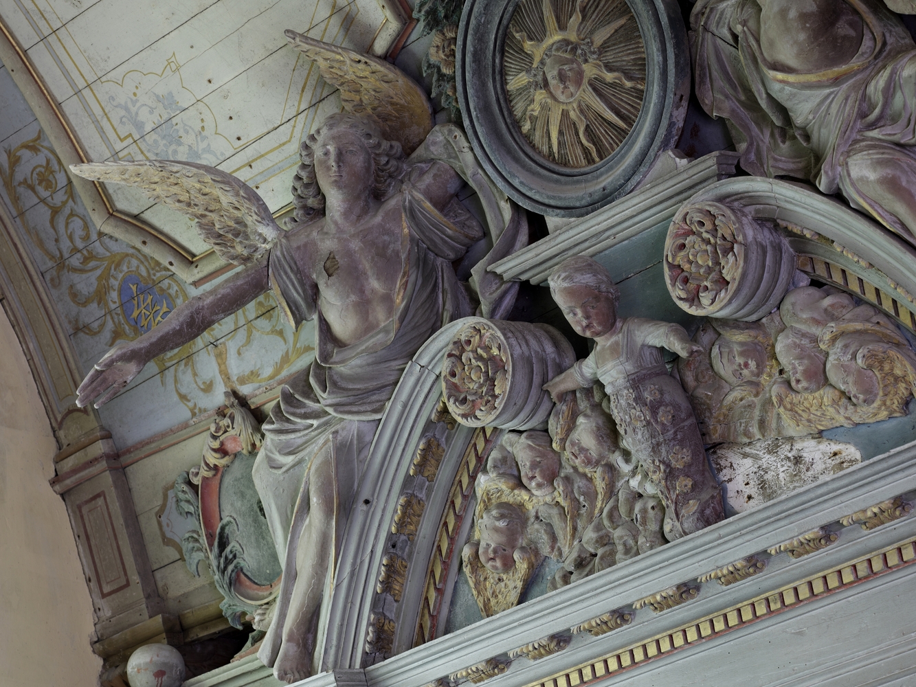 Lanvellec, Saint-Carré : chapelle Notre-Dame-de-Pitié, vue intérieure, détail de la partie supérieure du retable nordImmatriculation