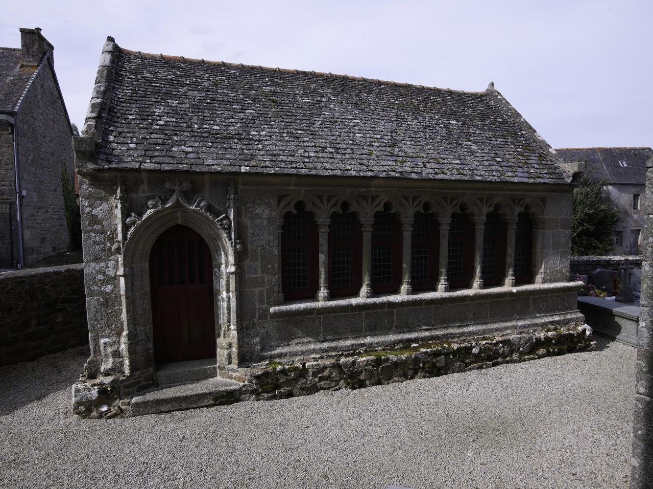 Lanvellec, le bourg : ossuaire, élévation antérieure orientée sud-est. L'édifice est ouvert de sept arcades à arc trilobé séparées par des colonnettes jumeléesImmatriculation