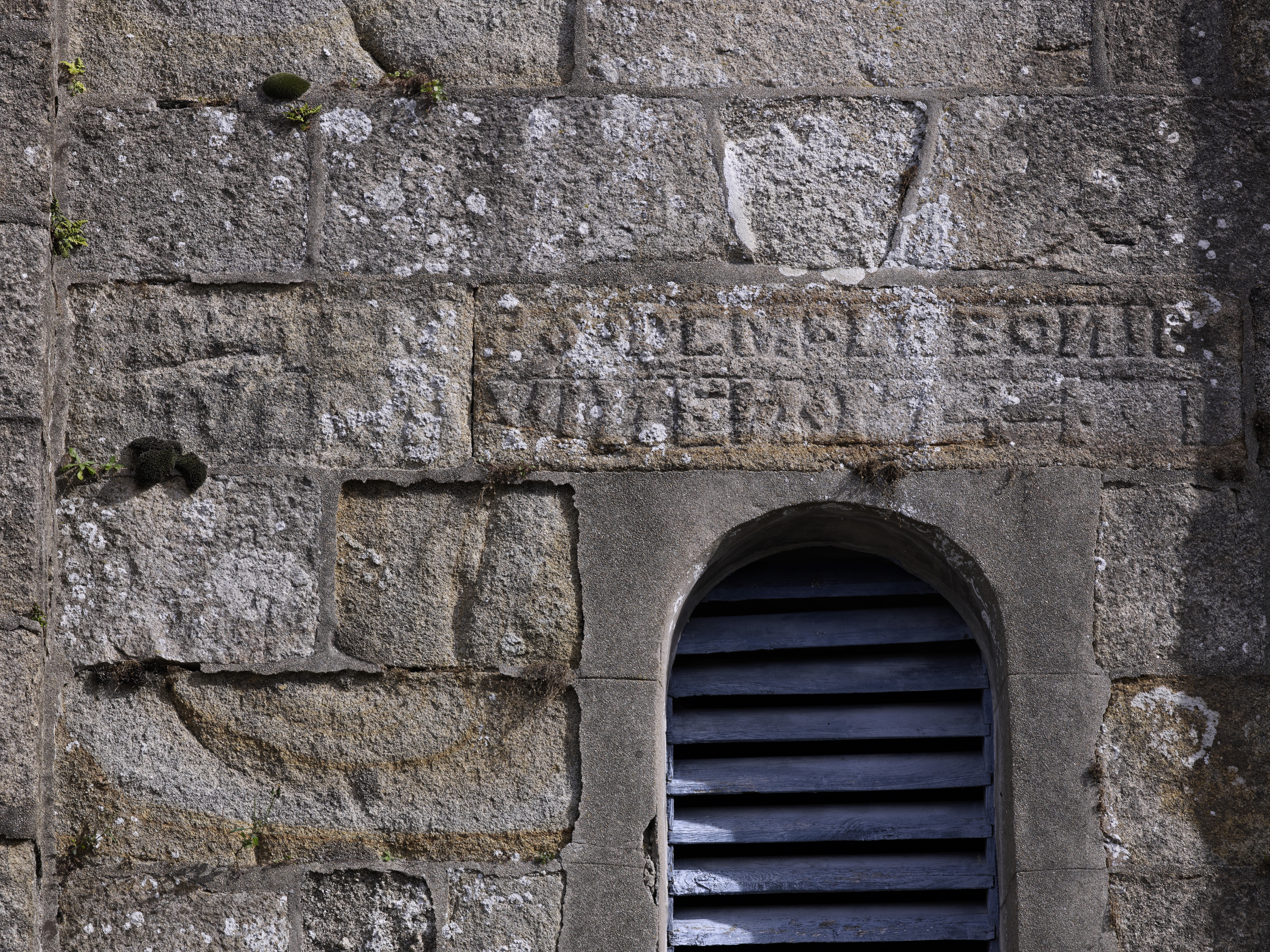 Cavan, le bourg : église paroissiale Saint-Chéron, clocher, détail de l'inscriptionImmatriculation