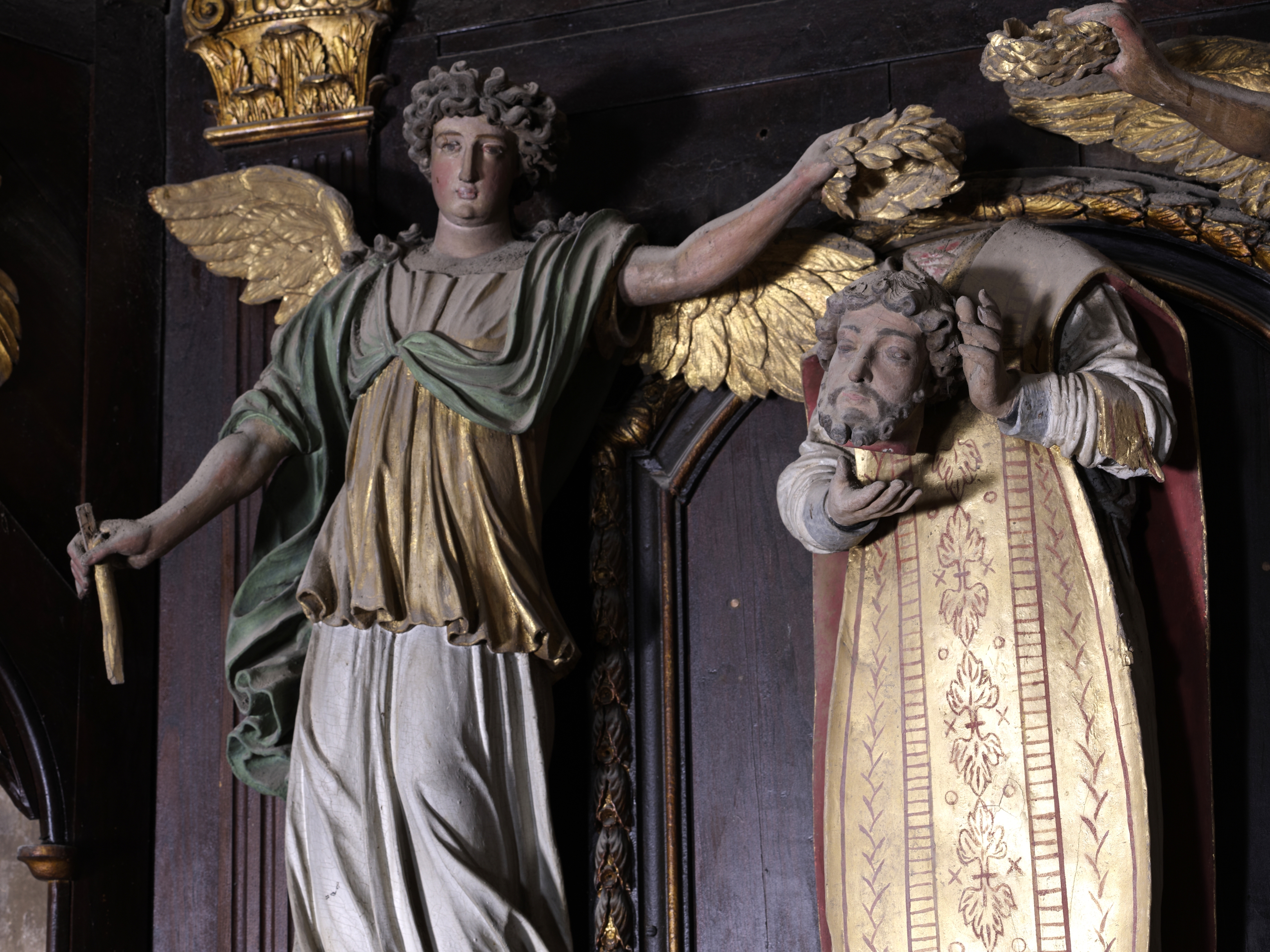 Cavan, le bourg : église paroissiale Saint-Chéron, vue intérieure, statue représentant saint Chéron (portant sa tête dans la main droite et une palme dans celle de gauche)Immatriculation
