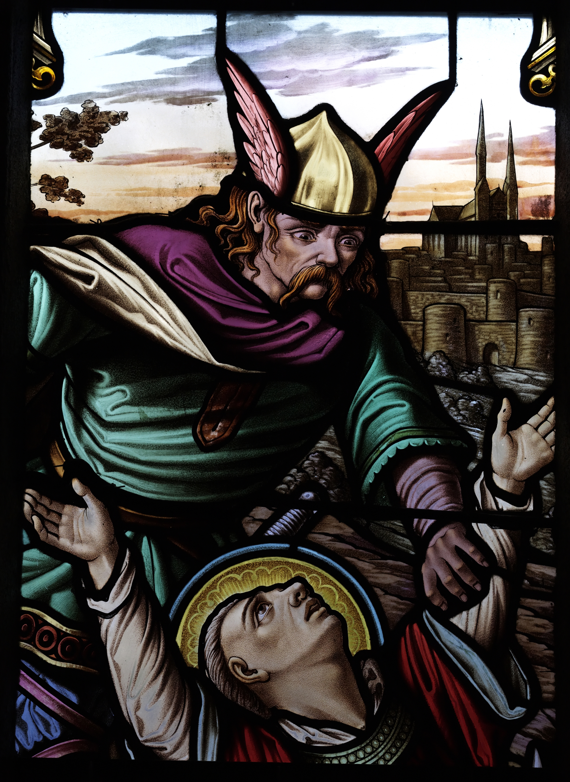 Cavan, le bourg : église paroissiale Saint-Chéron, vue intérieure, détail du vitrail représentant le martyr de saint ChéronImmatriculation