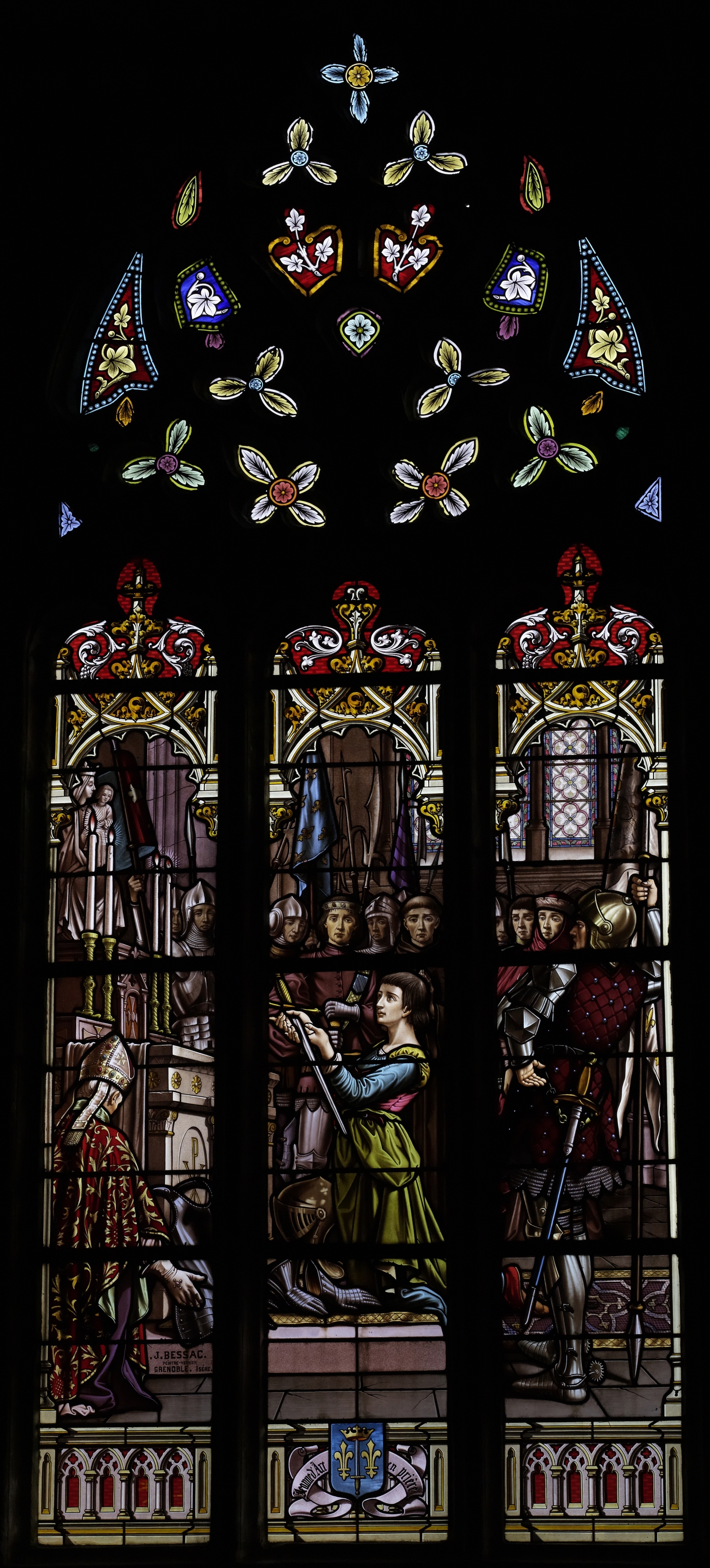 Cavan, le bourg : église paroissiale Saint-Chéron, vue intérieure, vitrail représentant Jeanne d'Arc en prière par J. BESSAC, peintre-verrier de Grenoble en IsèreImmatriculation