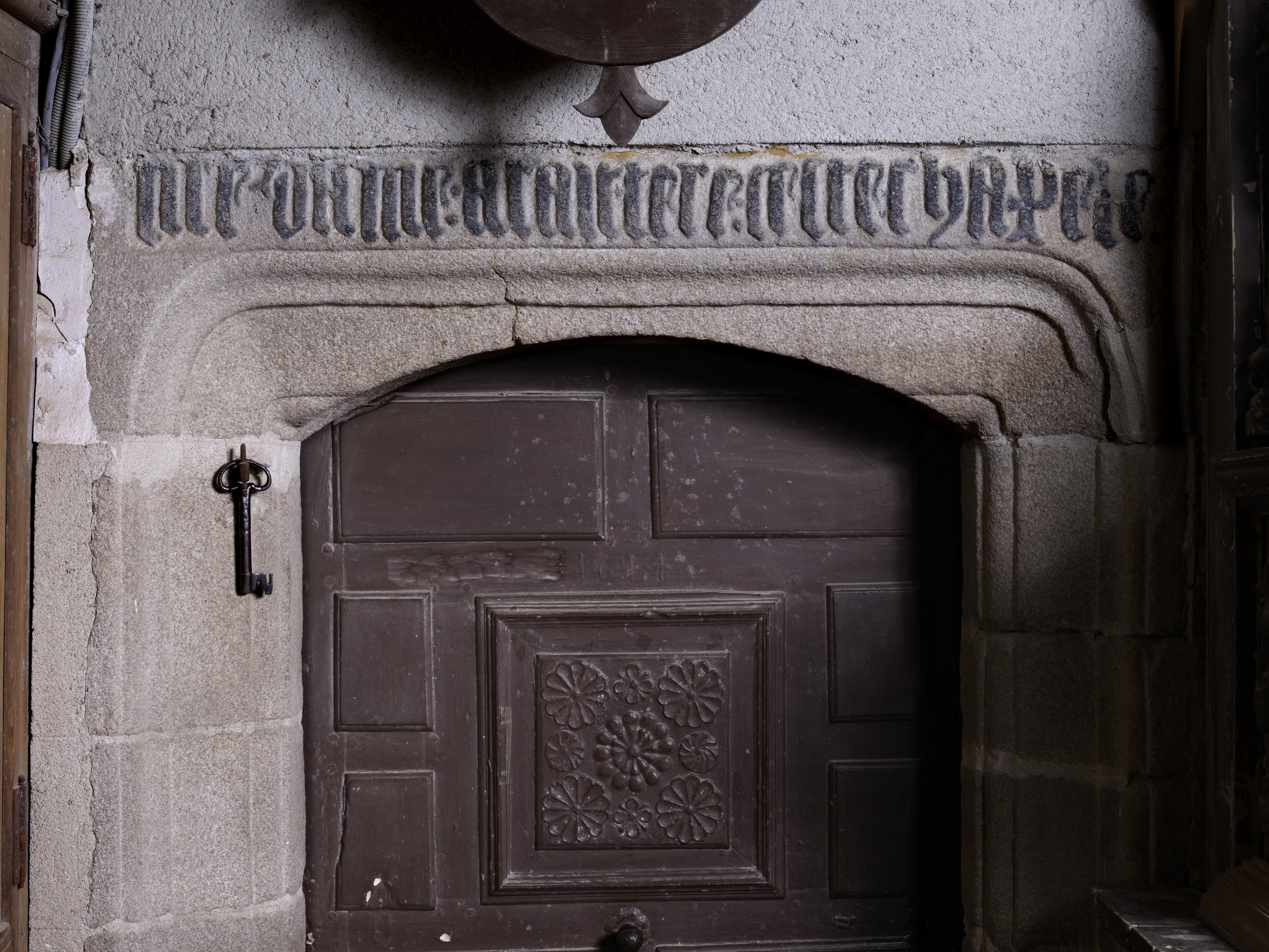 Cavan, le bourg : église paroissiale Saint-Chéron, vue intérieure, inscription située à l'entrée de la sacristie. La porte est datée de 1614Immatriculation