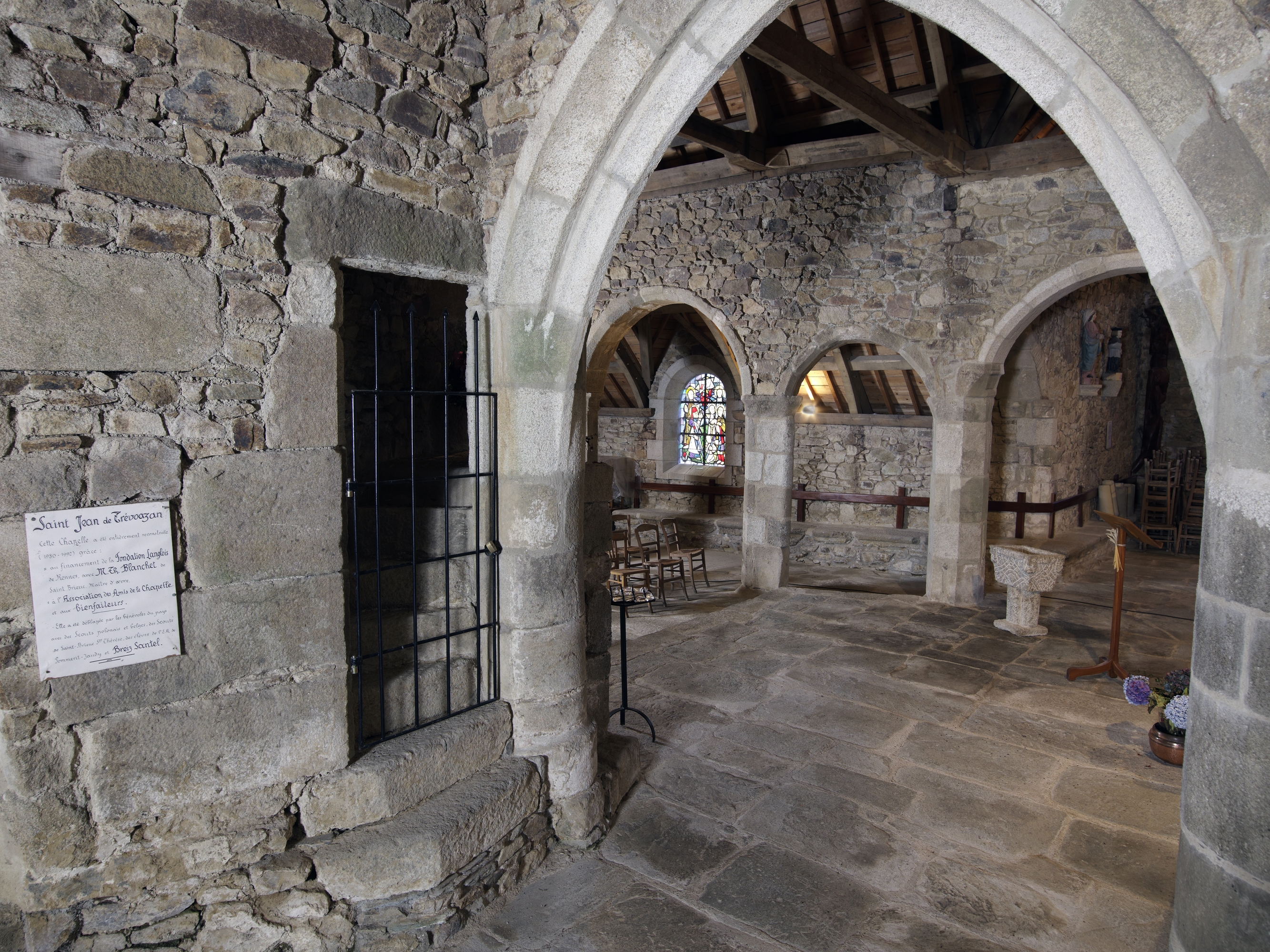 Prat, Trévoazan : chapelle Saint-Jean de Trévoazan, vue intérieure, escalier dans le mur sud (état en 2012)Immatriculation