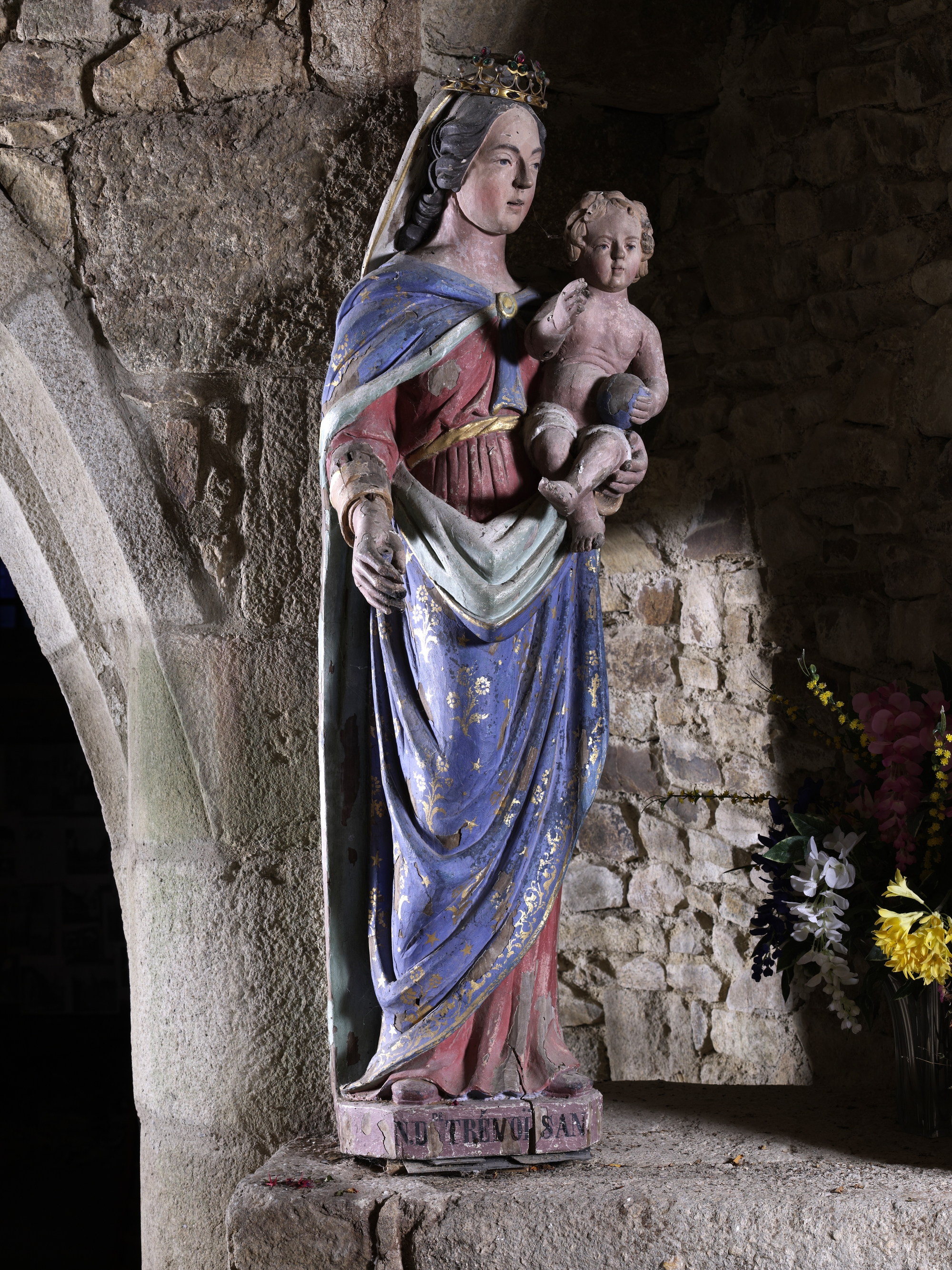 Prat, Trévoazan : chapelle Saint-Jean de Trévoazan, vue intérieure, statue représentant la Vierge à l'enfant (état en 2012)Immatriculation