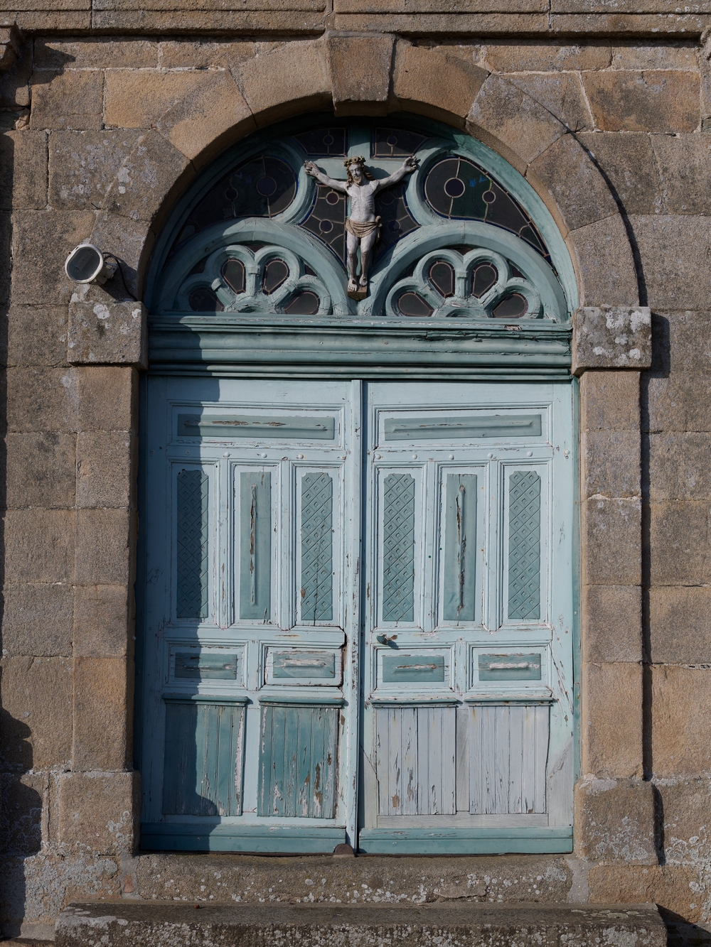 Prat, le bourg : église paroissiale Saint-Pierre, porche sud, porte, vue de détailImmatriculation