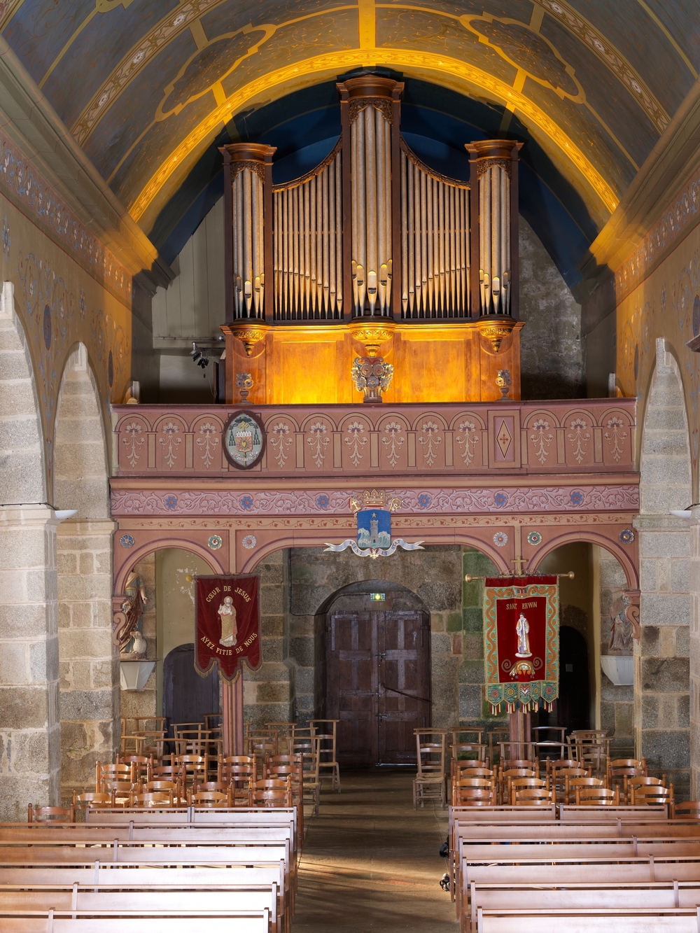 Prat, le bourg : église paroissiale Saint-Pierre, vue intérieure, nef et orgueImmatriculation
