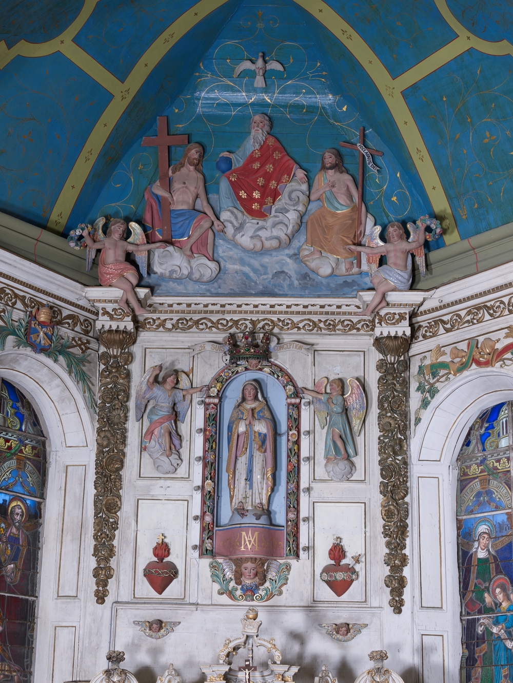 Prat, le bourg : église paroissiale Saint-Pierre, vue intérieure, choeur, ornementationImmatriculation