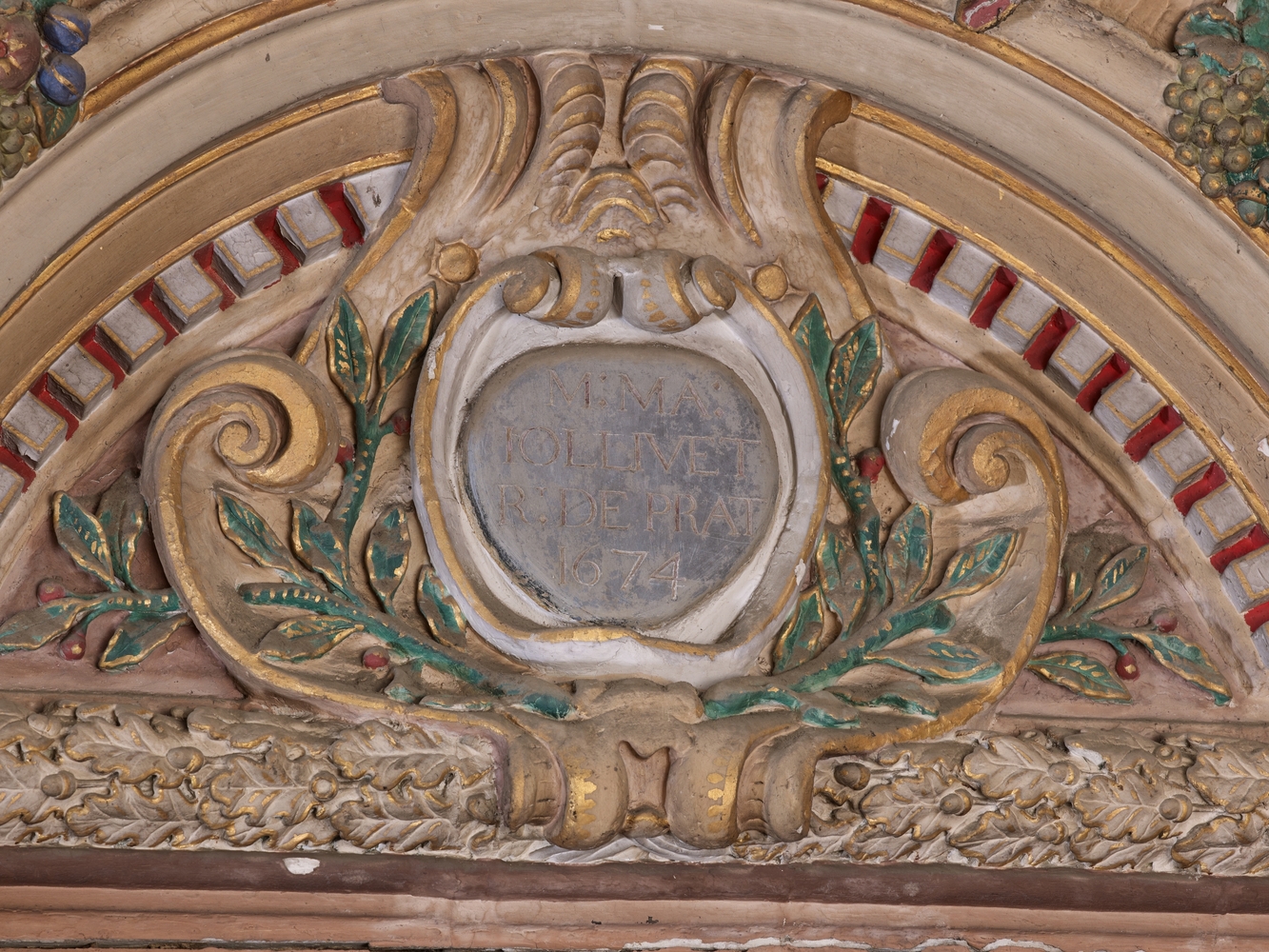 Prat, le bourg : église paroissiale Saint-Pierre, vue intérieure, retable sud, inscription et millésime M : MA : IOLLIVET R : DE PRAT 1674Immatriculation