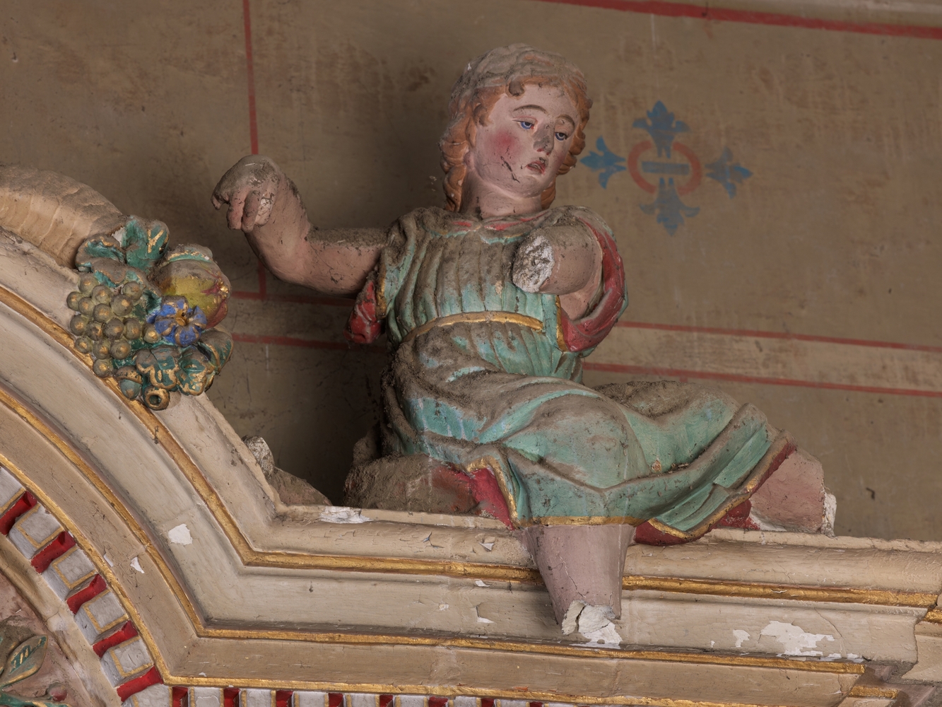 Prat, le bourg : église paroissiale Saint-Pierre, vue intérieure, retable sud, ange musicienImmatriculation