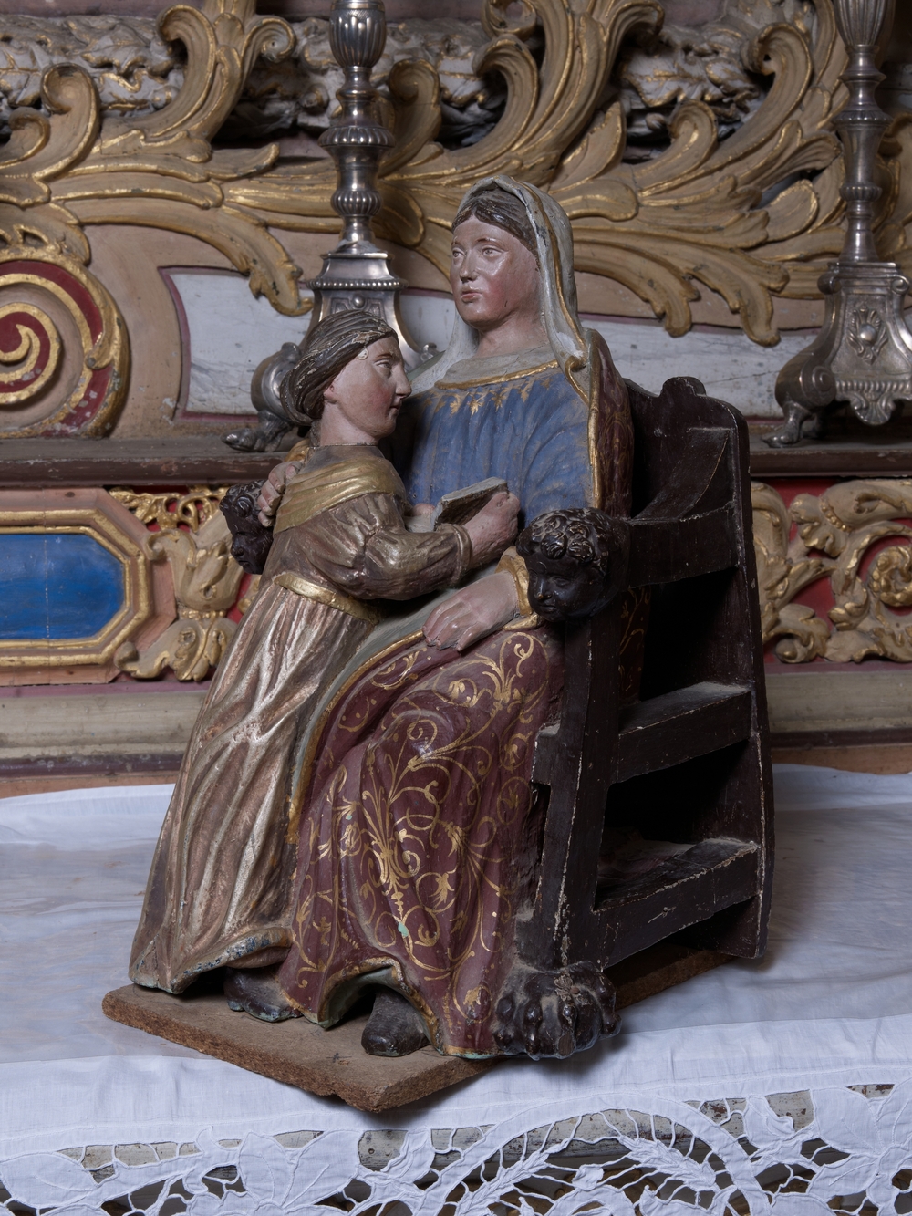 Prat, le bourg : église paroissiale Saint-Pierre, vue intérieure, statue, l'éducation de la ViergeImmatriculation