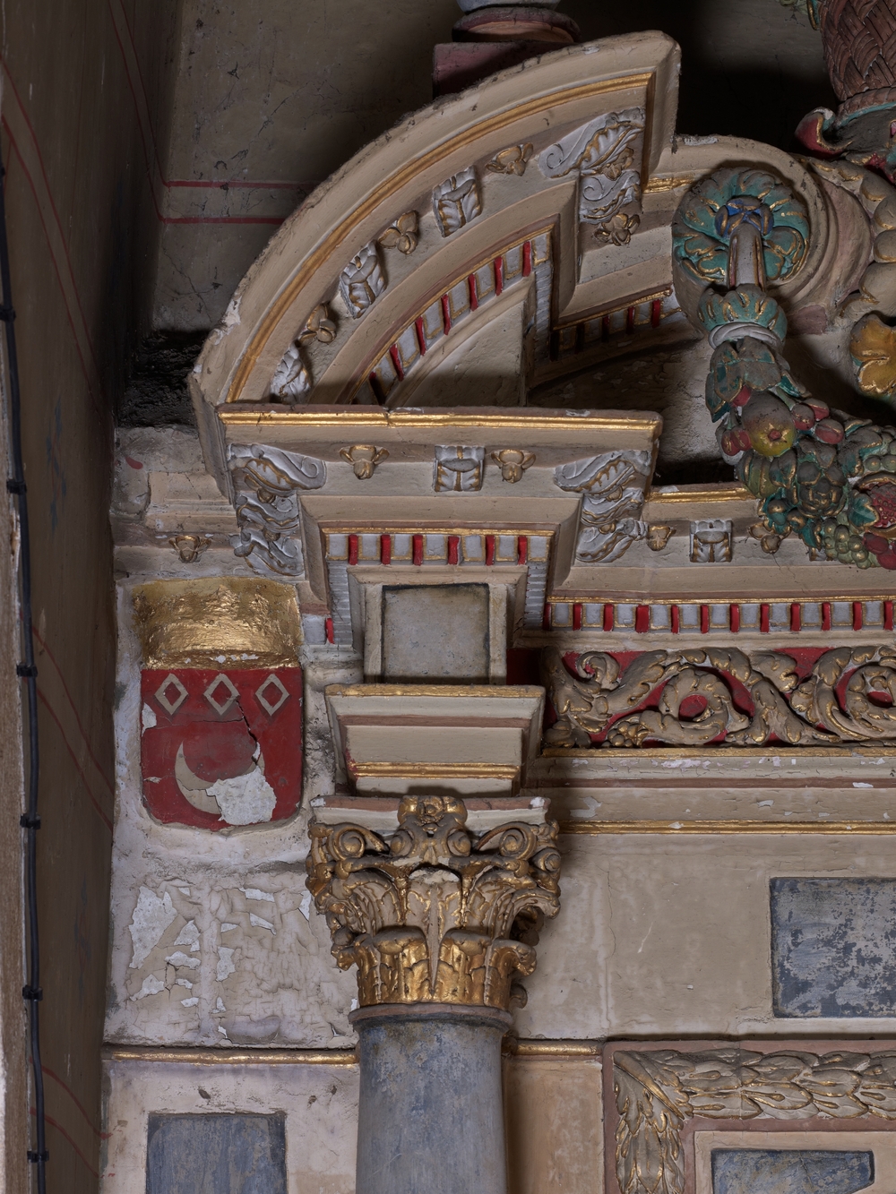 Prat, le bourg : église paroissiale Saint-Pierre, vue intérieure, retable sud, armoiriesImmatriculation