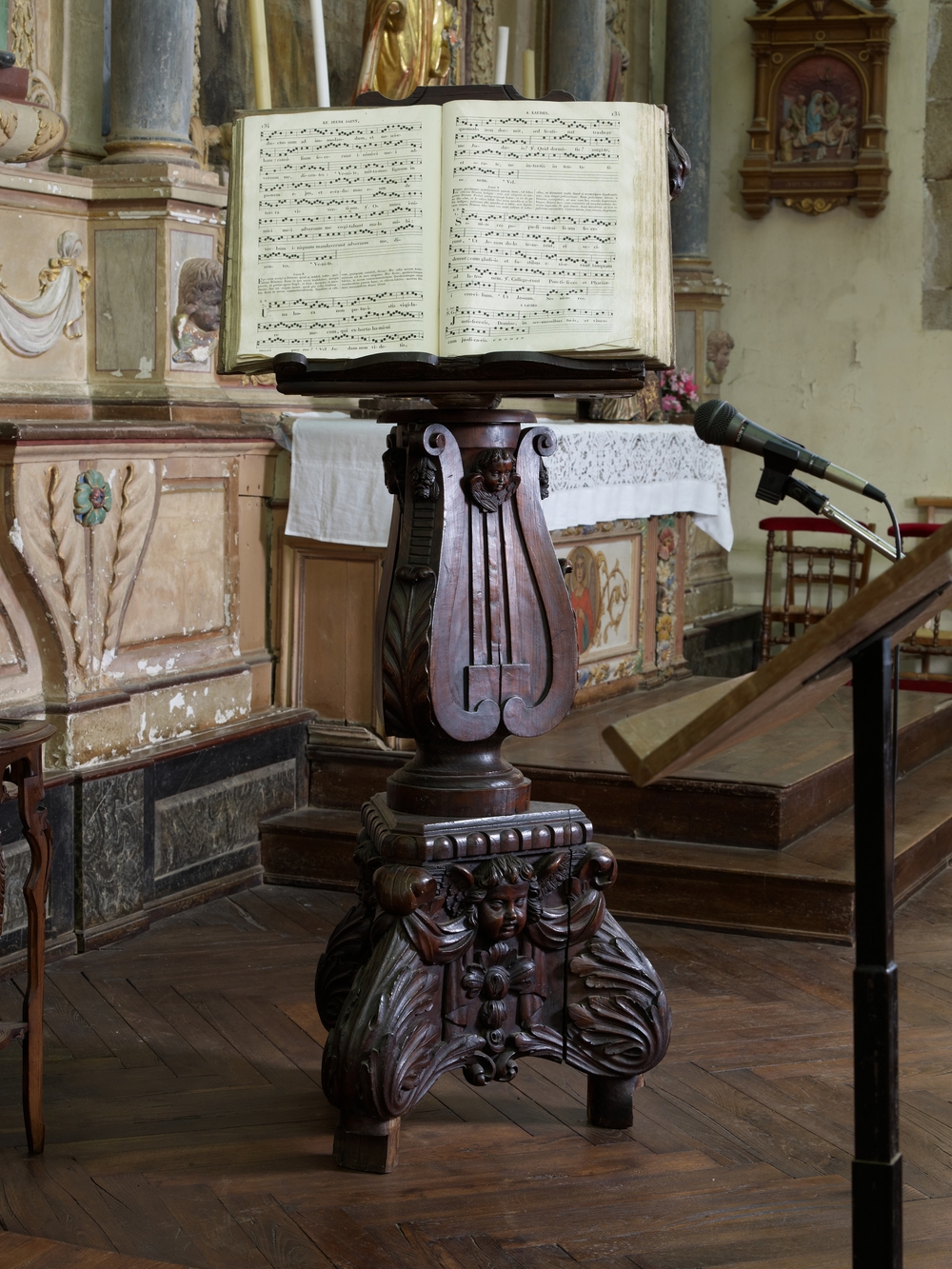 Prat, le bourg : église paroissiale Saint-Pierre, vue intérieure, lutrinImmatriculation