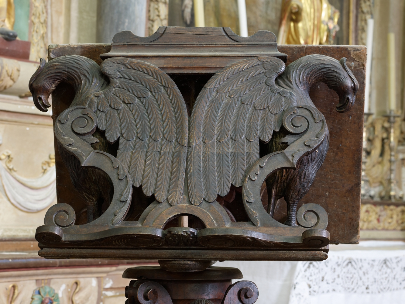 Prat, le bourg : église paroissiale Saint-Pierre, vue intérieure, lutrinImmatriculation