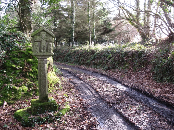 Plouaret, Kerbridou : manoir, accès ouest et croix de chemin en granite à bâtièreImmatriculation