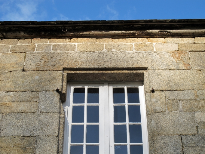 Plouaret, Kerdanet : ferme, élévation antérieure, travée centrale, fenêtre. Le linteau porte l'inscription : F. F. P : I M. [Jean-Marie] LE MORVAN ET M A [Marie-Anne] LE GOURONNEC SON EPOUSEImmatriculation