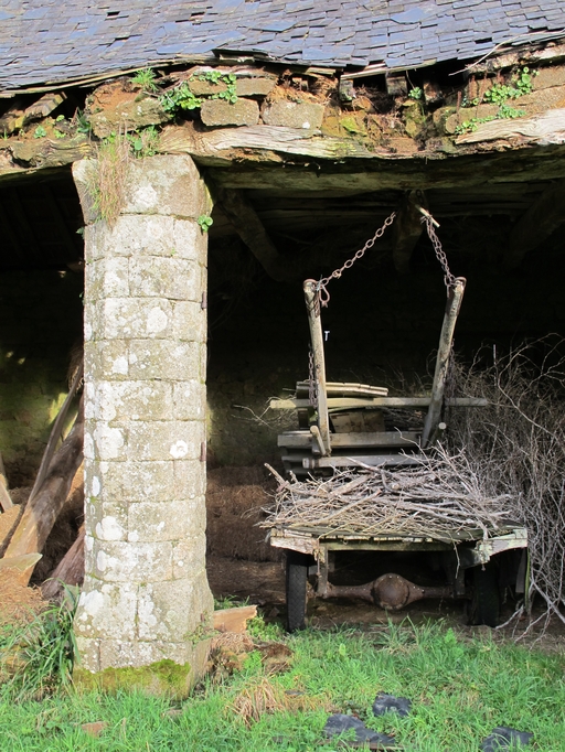Plouaret, Porz Huon : grange, élévation antérieure, détail de l'un des deux pilliers. Ancienne charretteImmatriculation