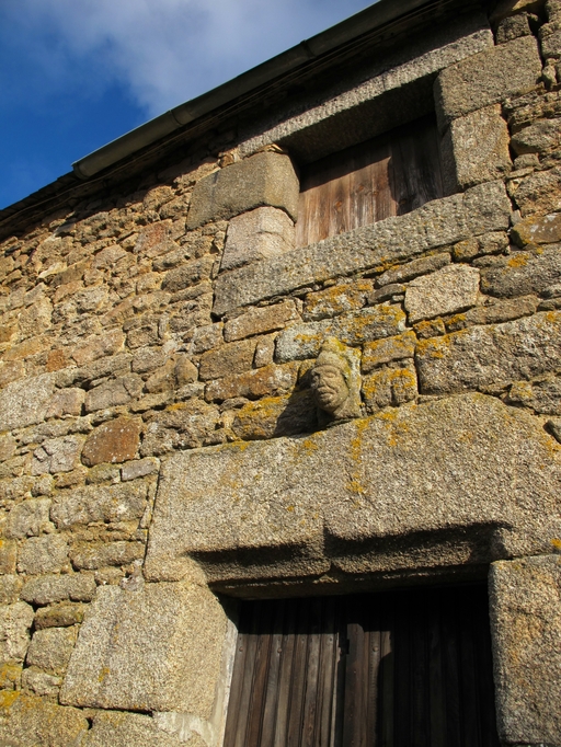 Plouaret, Run Riou : étable, élévation antérieure, porte rectangulaire remployant des éléments de la fin du 16e siècle ou du début du 17e siècle (linteau à double accolade). Tête sculptée surplombant l'entrée estImmatriculation