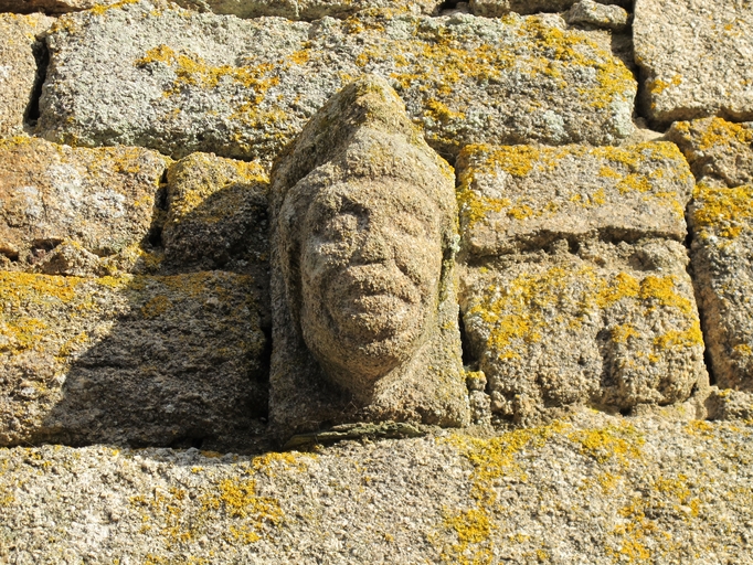 Plouaret, Run Riou : étable, élévation antérieure, tête humaine sculptée surplombant l'entrée sud et représentant un hommeImmatriculation