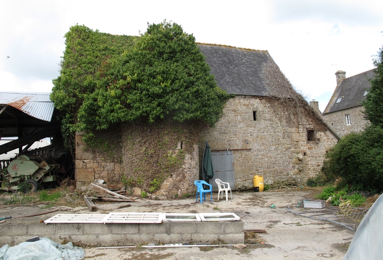 Pluzunet, Guermarquer : manoir primitif (2e moitié 16e siècle) aujourd'hui dépendance, élévation postérieure orientée vers l'est. Sous la végétation, la tourelle accueillant l'escalier en visImmatriculation
