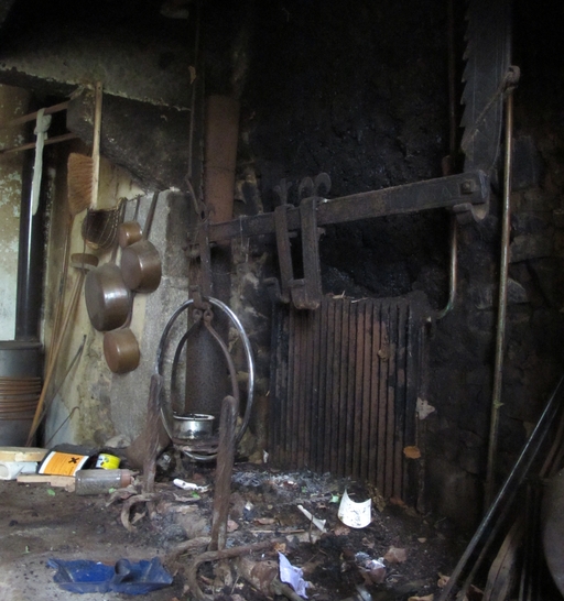 Pluzunet, Kerlistouedou : ferme, vue intérieure, cuisine, détail de la cheminée, crémaillère ancienne (tige ou barre garnie de crans) et ses crochetsImmatriculation