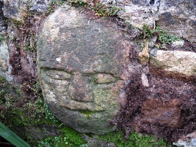 Pluzunet, le Cosquer : dépendance, détail d'une pierre sculptée représentant une tête humaineImmatriculation