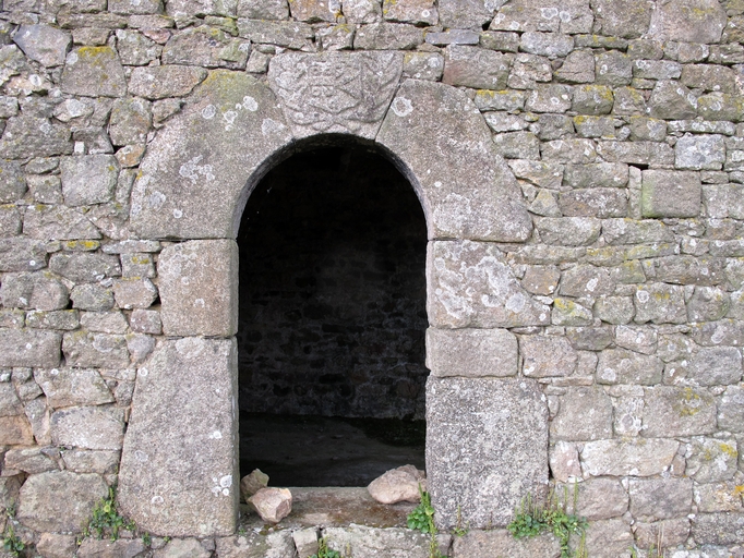 Pluzunet, Kerjean : grange, élévation antérieure, porte en arc plein cintre surmontée d'armoiries (?)Immatriculation