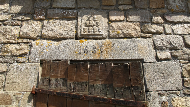 Pluzunet, Lézodec : écurie, détail d'un linteau daté 1885 et surmonté d'un écu renverséImmatriculation