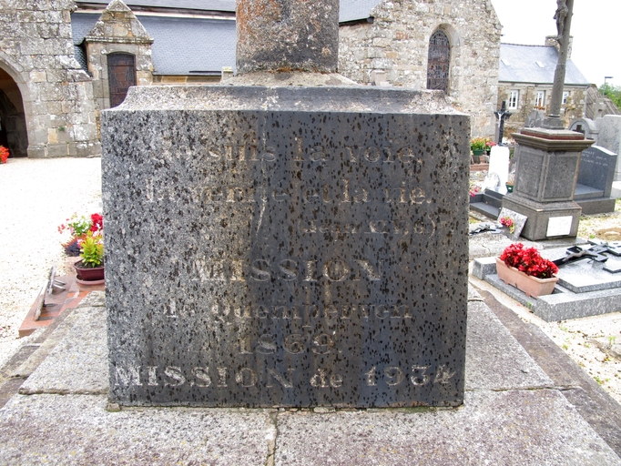 Vue de la croix de cimetière de type Hernot, détail du socle. Inscriptions : "Je suis la voie, la vérité et la vie (Jean XIV, 6)" ; "Mission de Quemperven 1869" ; "Mission de 1934"Immatriculation