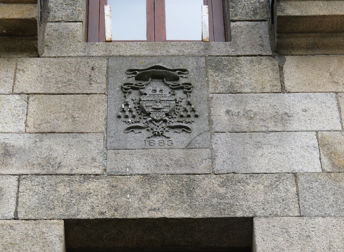 Cavan, le bourg, 3 rue Jean Monnet : ancien presbytère puis Maison de la Culture Bretonne en Trégor-Goëlo, élévation sud, détail de la travée centrale datée 1886Immatriculation