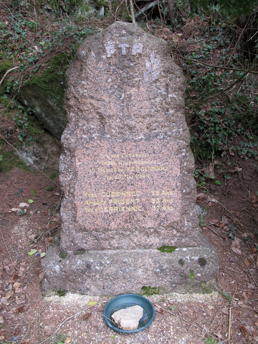 Tonquédec, Kerguiniou : monument commémoratif. La stèle porte l'inscription suivante : FTP / A nos camarades tombés glorieusement au maquis de Kerguiniou le 23 mai 1944. Yves Cudennec 22 ans / Amédée Prigent 23 ans / Yves Derriennic 37 ansImmatriculation