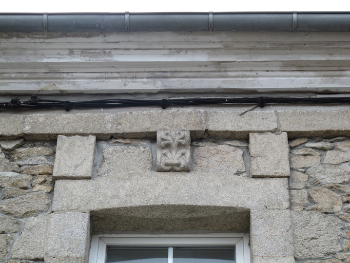 Tonquédec, le bourg, 4 place du bourg : magasin de commerce (3e quart 19e siècle), élévation antérieure, corniche et sablière, vue de détailImmatriculation