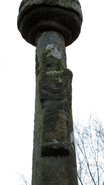 Tonquédec, le bourg, rue de la Mairie : croix de chemin, Vierge à l'enfant sculptée sur le fût, vue de détailImmatriculation