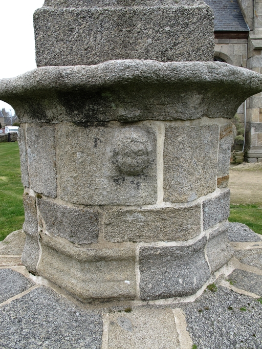 Tonquédec, le bourg, place de l'église : croix monumentale, socle, ornementation, vue de détailImmatriculation