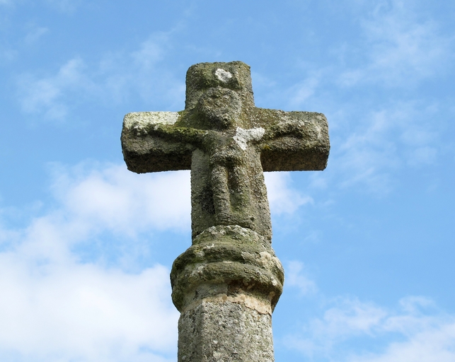 Tonquédec, Saint-Gildas : croix de chemin, Christ en croix, vue de détailImmatriculation