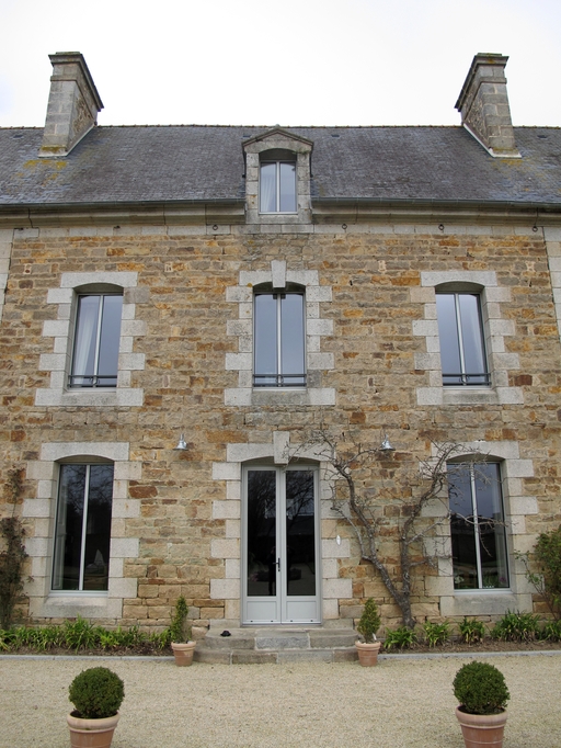 Tonquédec, le bourg, 3 route du Château : presbytère, élévation antérieure orientée vers le sud-sud-est, travée centrale, vue de détailImmatriculation