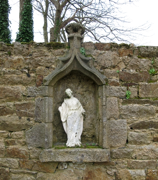 Tonquédec, le bourg, 3 route du Château : niche et statue situées dans le jardin, vue de détailImmatriculation