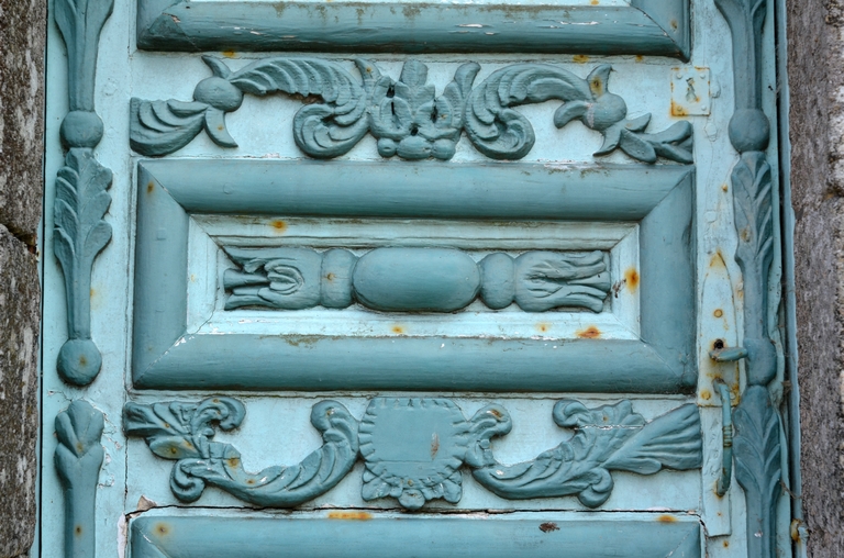Prat, le bourg : église paroissiale Saint-Pierre, mur nord, porte, vue de détailImmatriculation