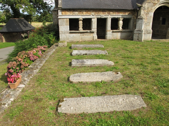 Prat, Trévoazan : chapelle Saint-Jean de Trévoazan, ossuaire d'attache. Au premier plan : pierres tombales (état en 2012)Immatriculation