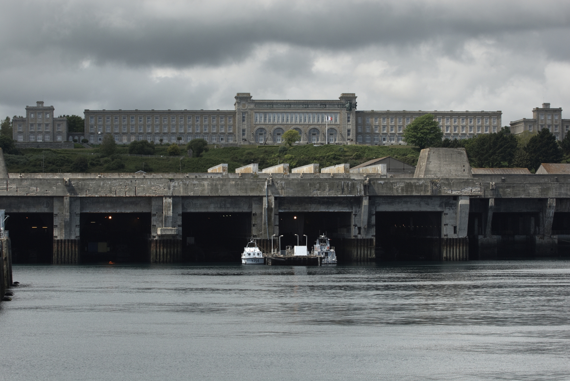 Vue générale depuis la rade abri en 2009. Au premier plan, la base de sous-marinsImmatriculation