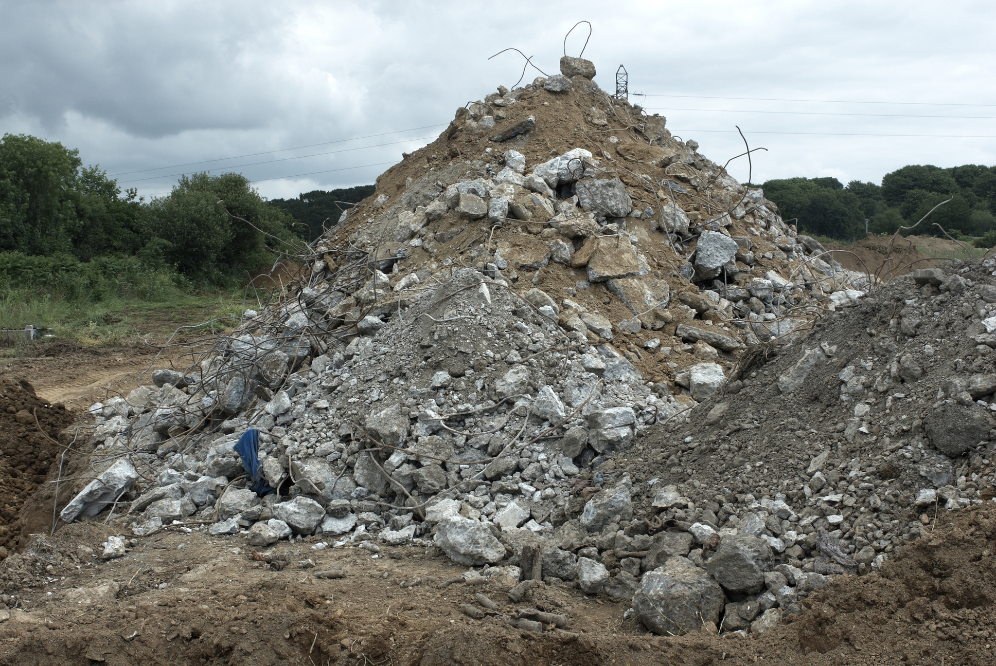 Résultat de la déconstruction d'un bunker avant le tri : éclats de béton et morceaux de fer à bétonImmatriculation