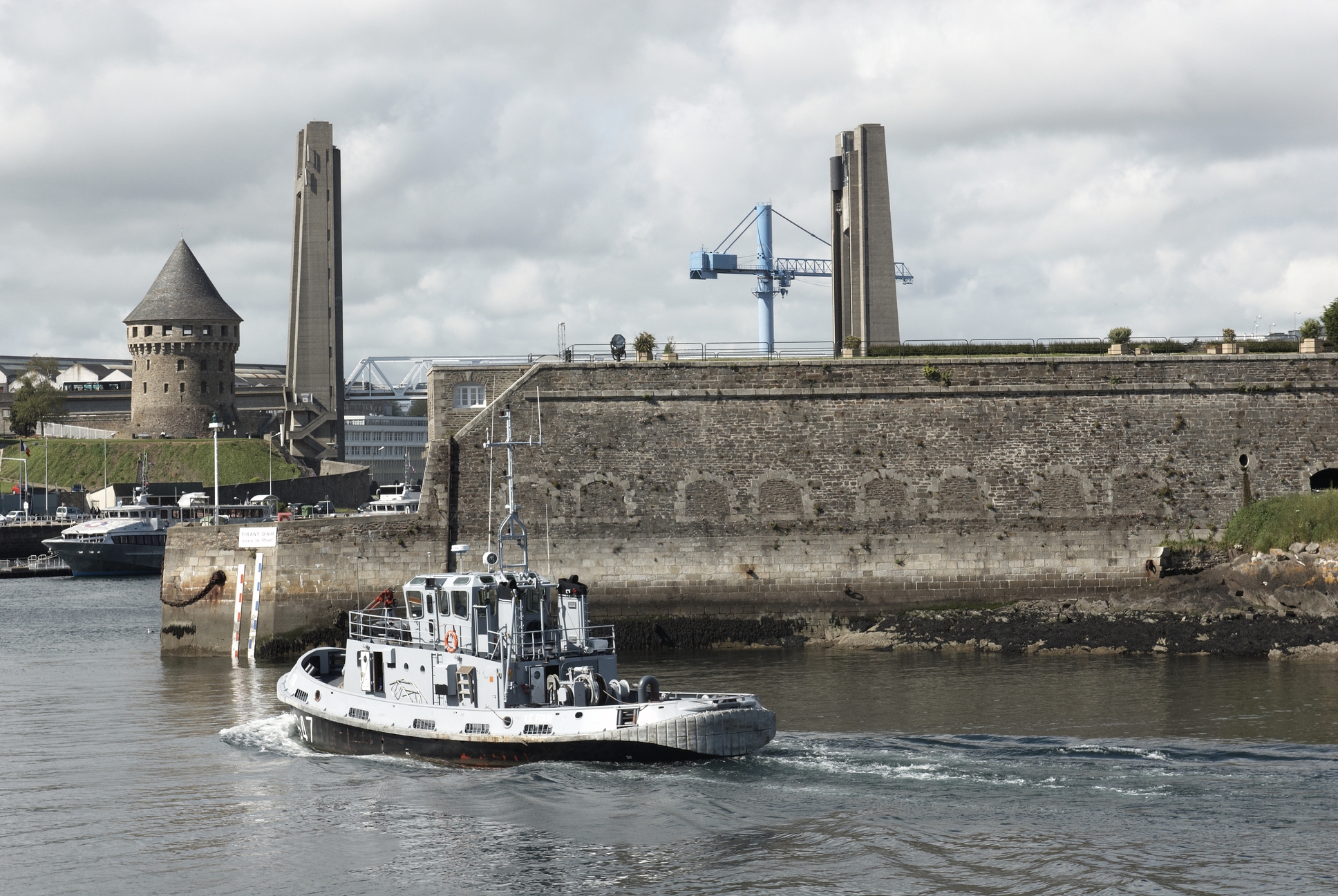 Vue de la batterie de la Rose. Au premier plan : un remorqueur ; à gauche, la Tour Tanguy et le pont de RecouvranceImmatriculation
