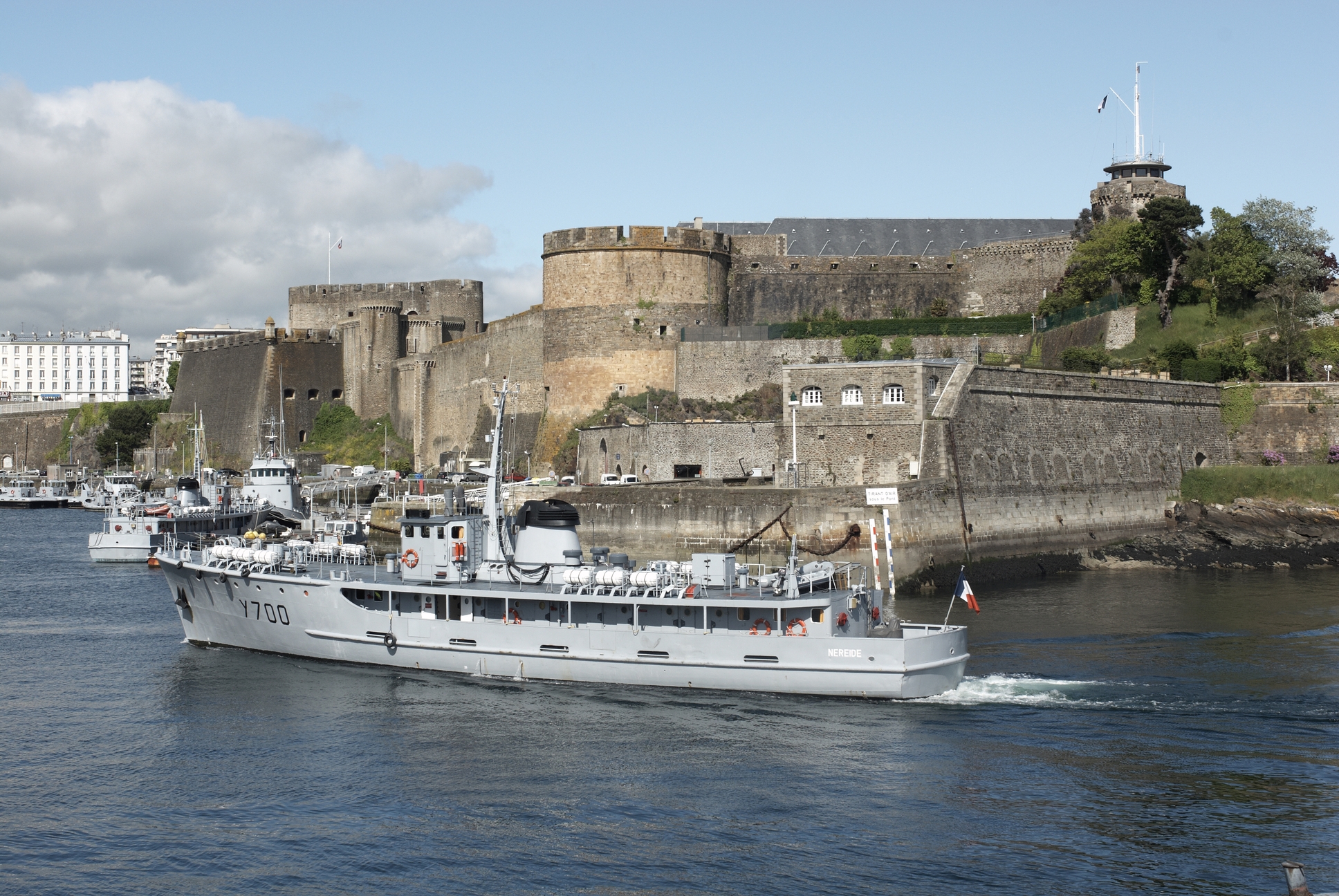 Vue générale du château en 2009. Au premier plan : navire transrade immatriculé Y 700 et la batterie de la RoseImmatriculation