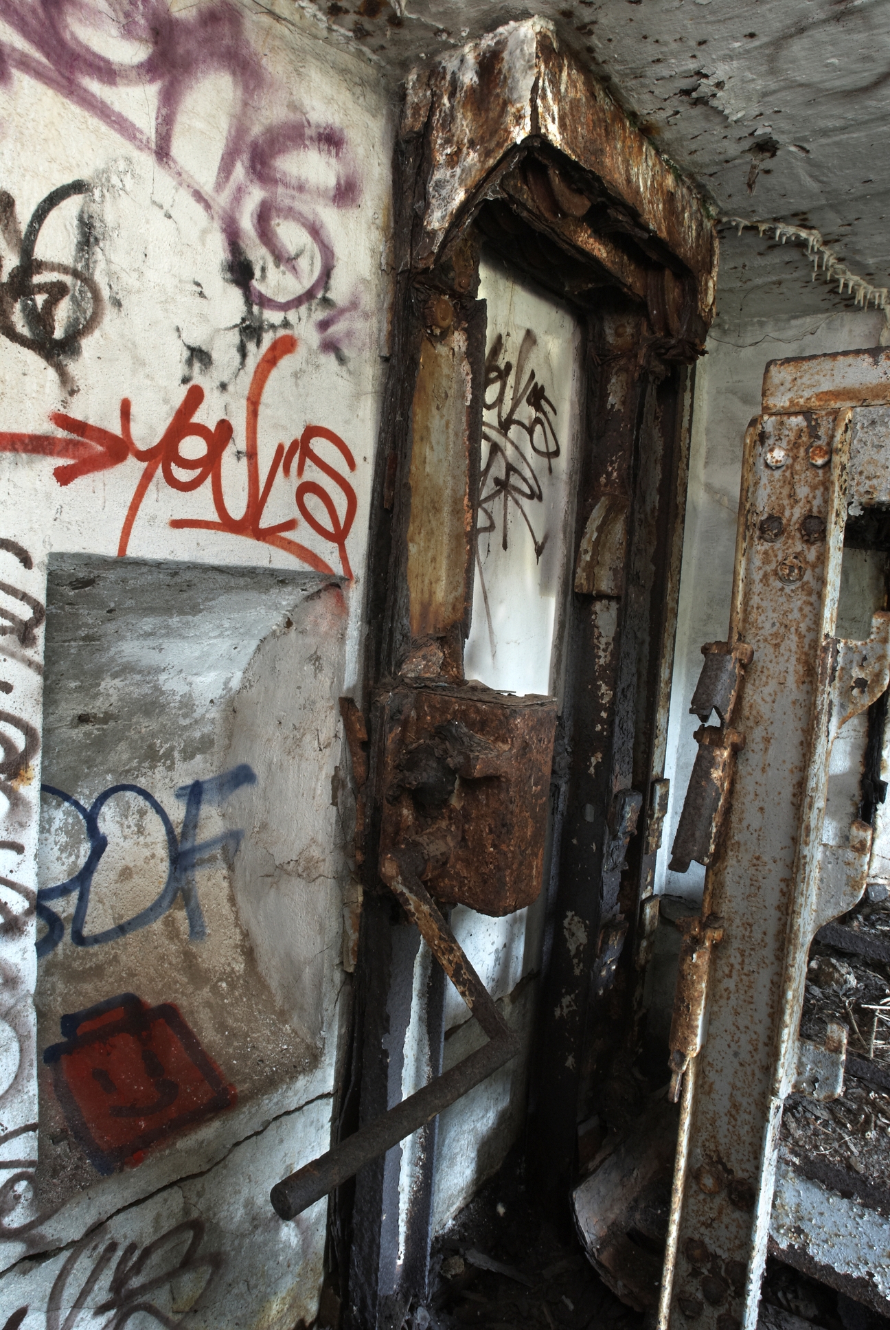 Vue intérieure de l'un des magasins de combat : étagère et monte-obus avec treuil manuel dans un compartiment à projectiles (état en 2009)Immatriculation