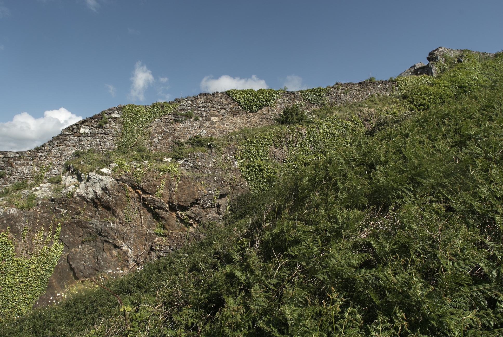 Vue de détail de la branche tombante du retranchement sud : le mur en maçonnerie repose sur le rocher de la falaise qui a été escarpée (état en 2009)Immatriculation